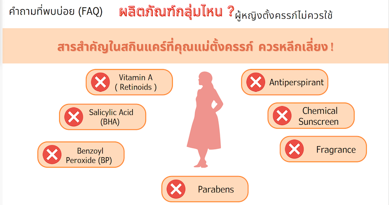 คุณแม่ตั้งครรภ์ควรหลีกเลี่ยงผลิตภัณฑ์ดูแลผิวที่มีส่วนผสมของเรตินอยด์ กรดซาลิไซลิก เบนโซอิลเปอร์ออกไซด์ พาราเบน สารกันเหงื่อ ครีมกันแดดเคมี และน้ำหอมเพื่อความปลอดภัย