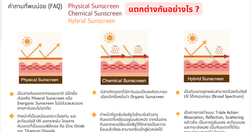 ทำหน้าที่เป็นเหมือนเกราะป้องกัน และสะท้อนรังสี UV ออกจากผิว โดยสารกันแดดที่เป็นแบบฟิสิคอล คือ Zinc Oxide และ Titanium Dioxide